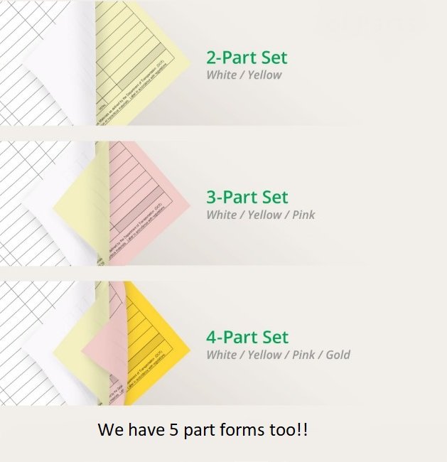We offer carbonless forms in three standard sizes to fit your business needs: half-page (5.5” x 8.5”), full-page (8.5” x 11”), and legal size (8.5” x 14”). Whether you need compact forms for quick transactions or larger formats for detailed documentation, we’ve got you covered. Our forms are available in 2-part, 3-part, 4-part, and even 5-part sets, giving you the flexibility to create multiple copies for record-keeping, customers, and internal use. If you need a custom size or specific configuration, let us know—we can tailor the forms to meet your exact requirements!